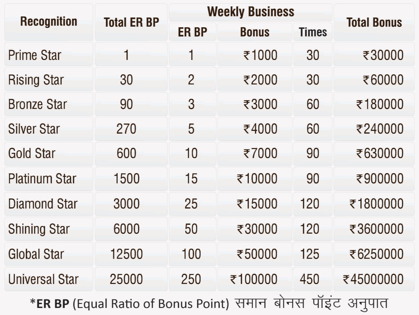 आपकी मुख्य टीम तथा अन्य टीमों के द्वारा अर्जित कुल बोनस पॉइंट के सामान बोनस पॉइंट अनुपात (Equal Ratio of Bonus Point) के आधार पर आप प्राइम बोनस टेबल के अनुसार प्राइम बोनस प्राप्त करेंगे।
